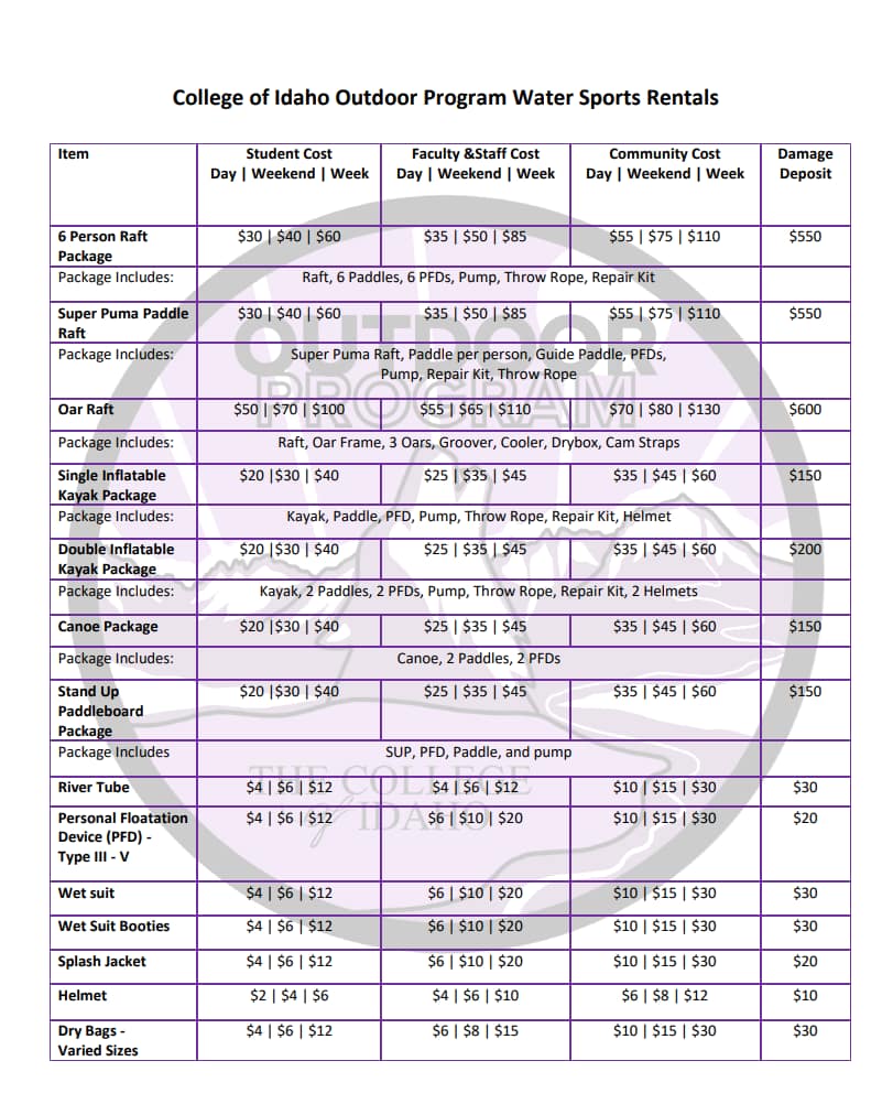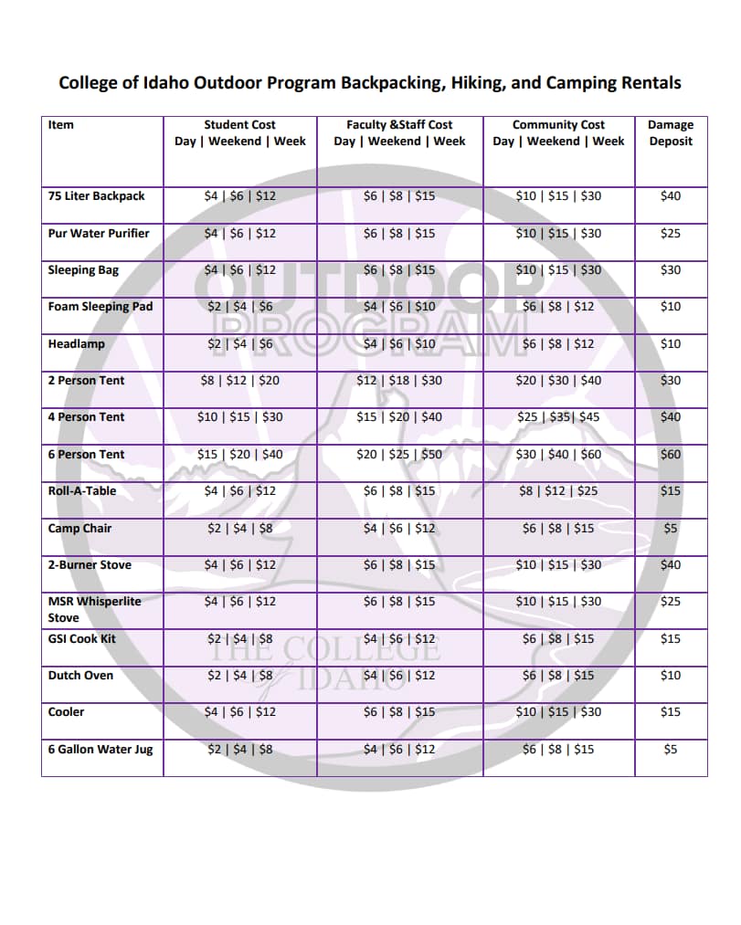 The rental lists that include price breakdowns are also available for download here: Outdoor Gear Rentals